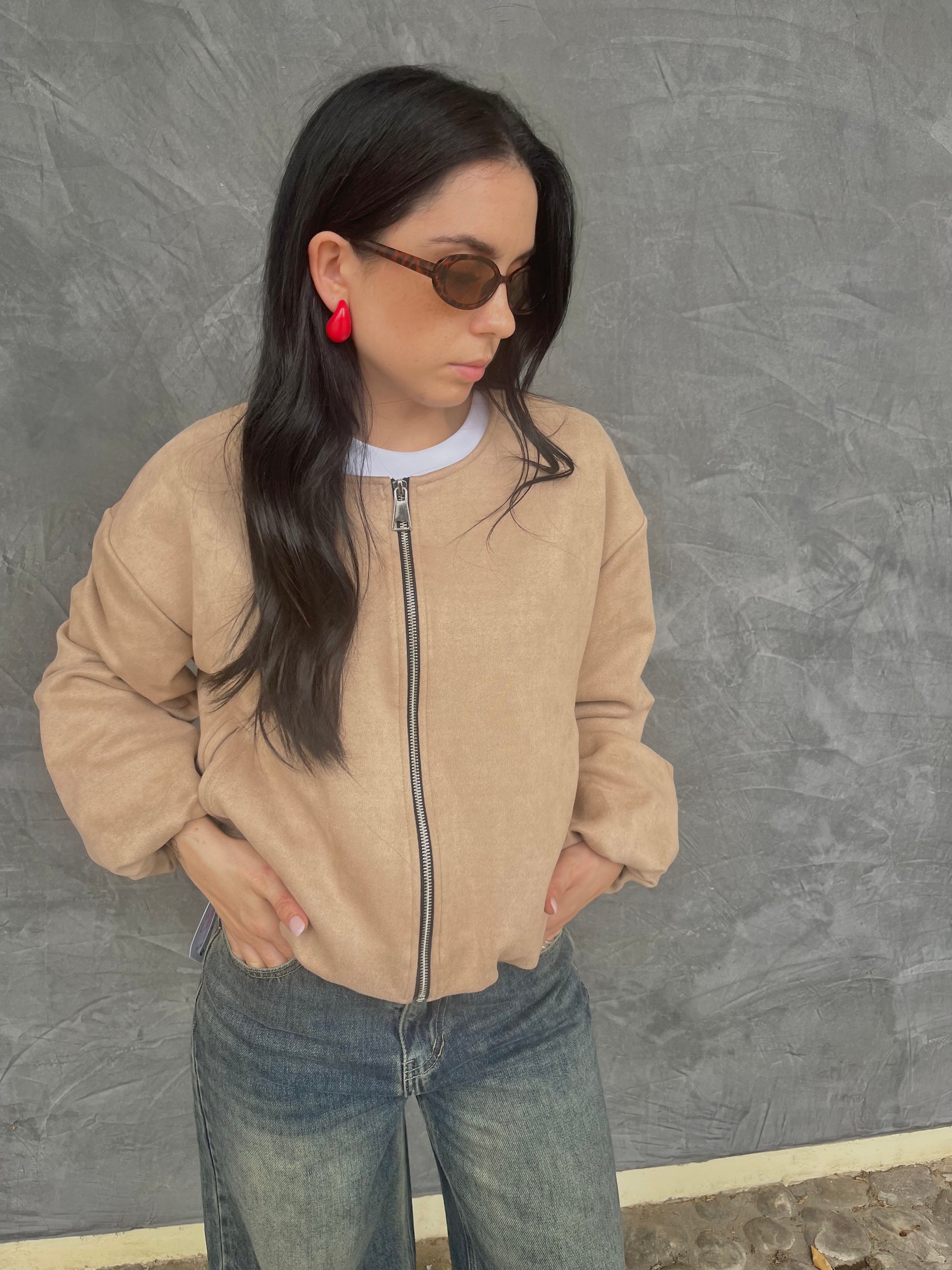 Bomber camoscio color beige/cammello, con zip frontale e maniche leggermente ampie con al polso un elastico morbido.