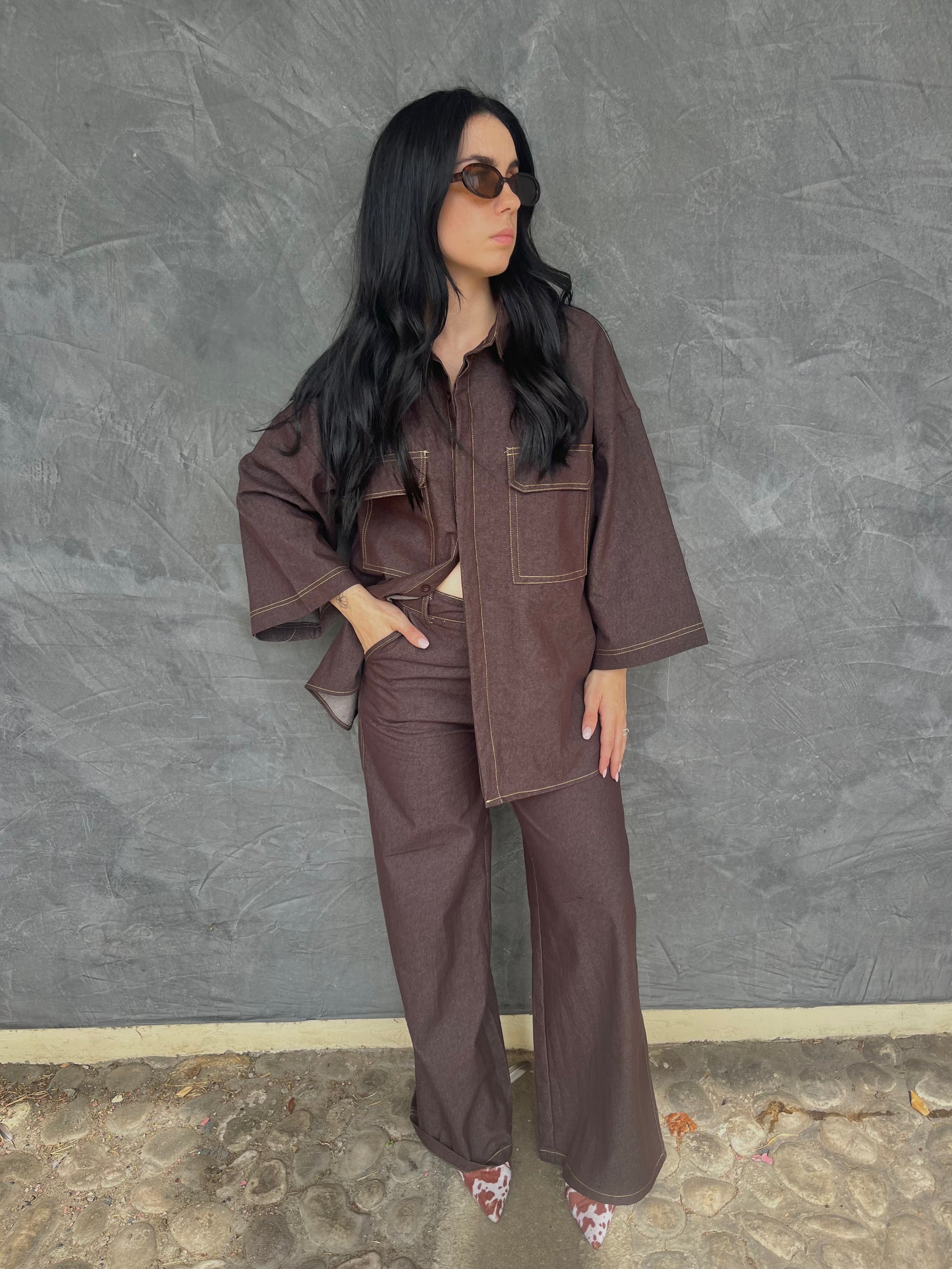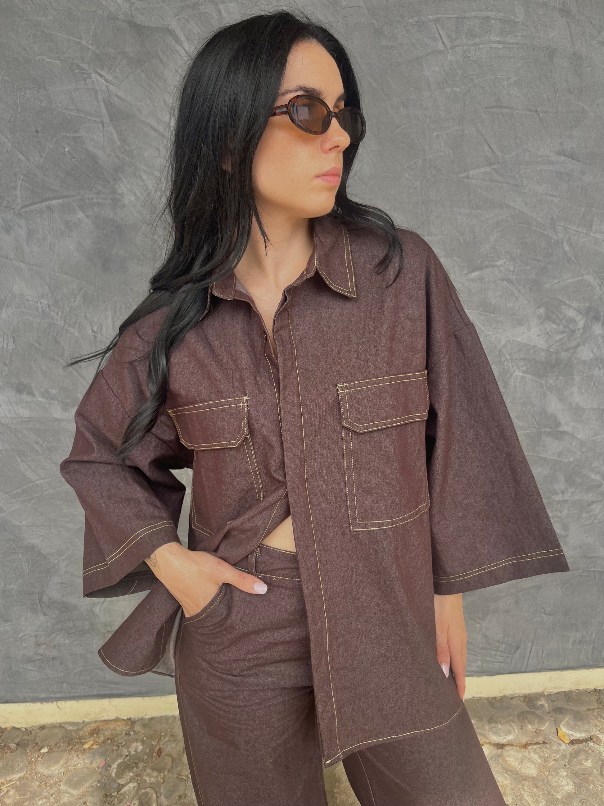 coordinato composto da pantalone ampio a gamba dritta, in tessuto effetto denim con cuciture a contrasto color giallo senape come la camicia oversize con tasche zona petto.