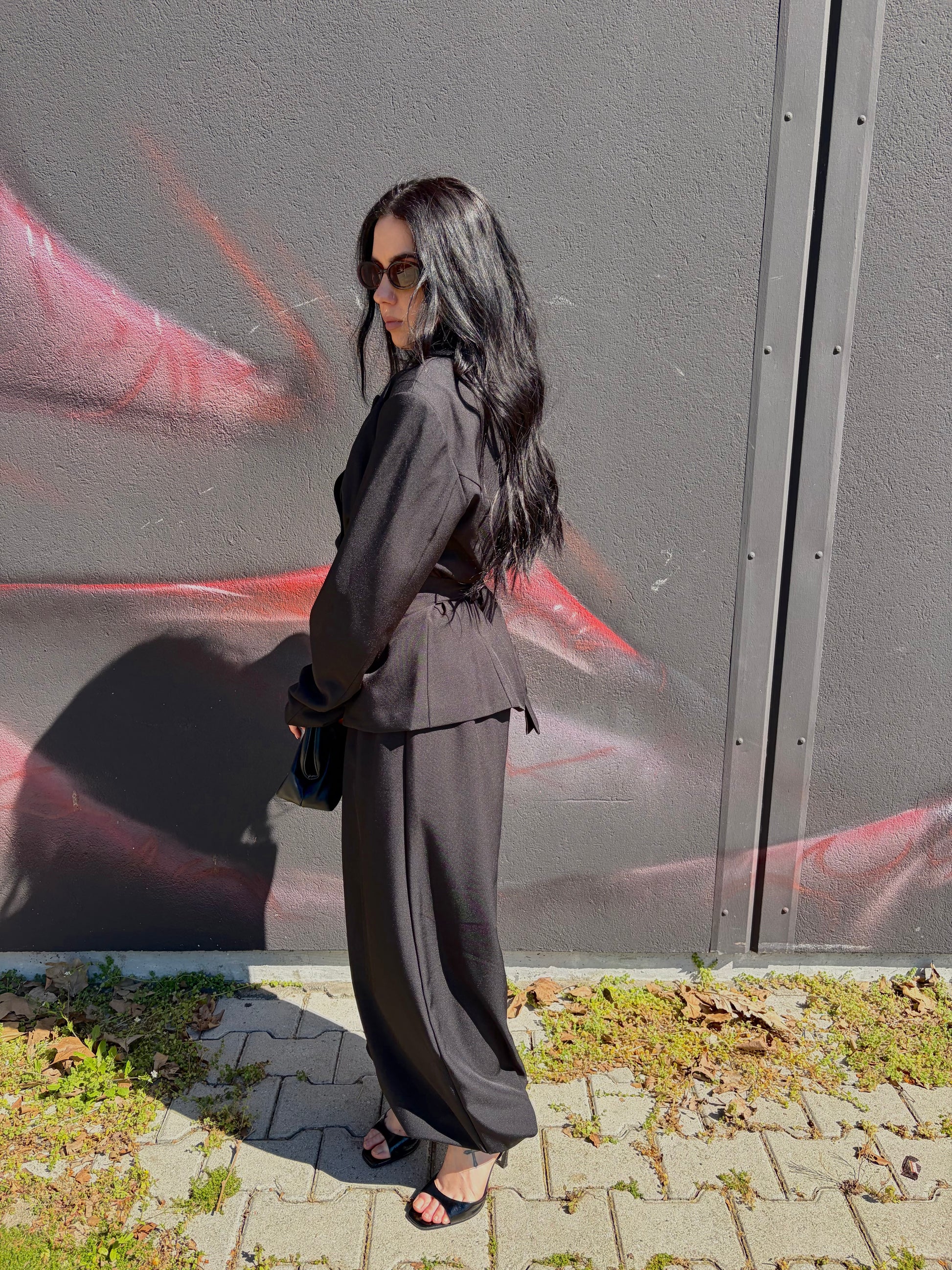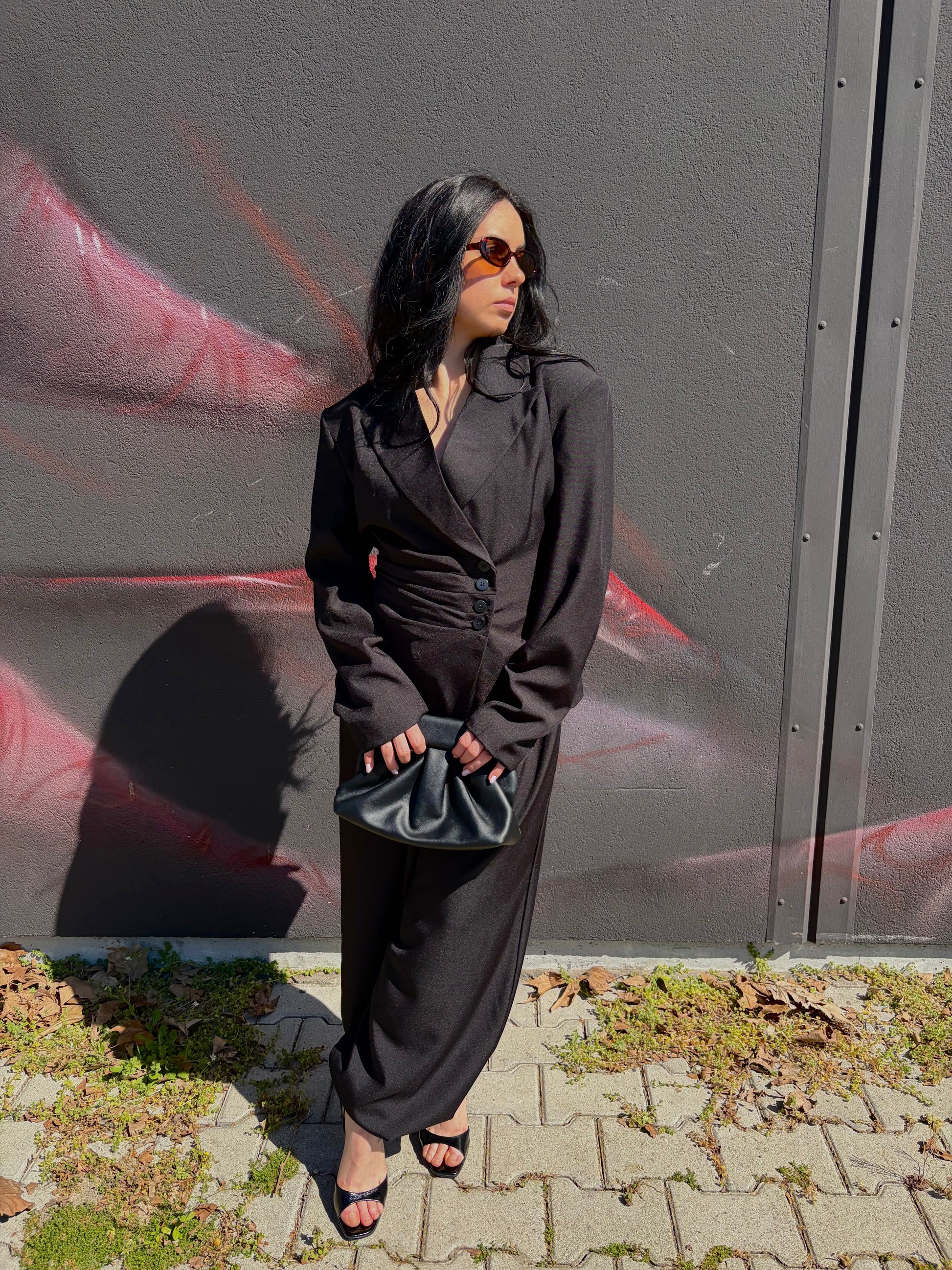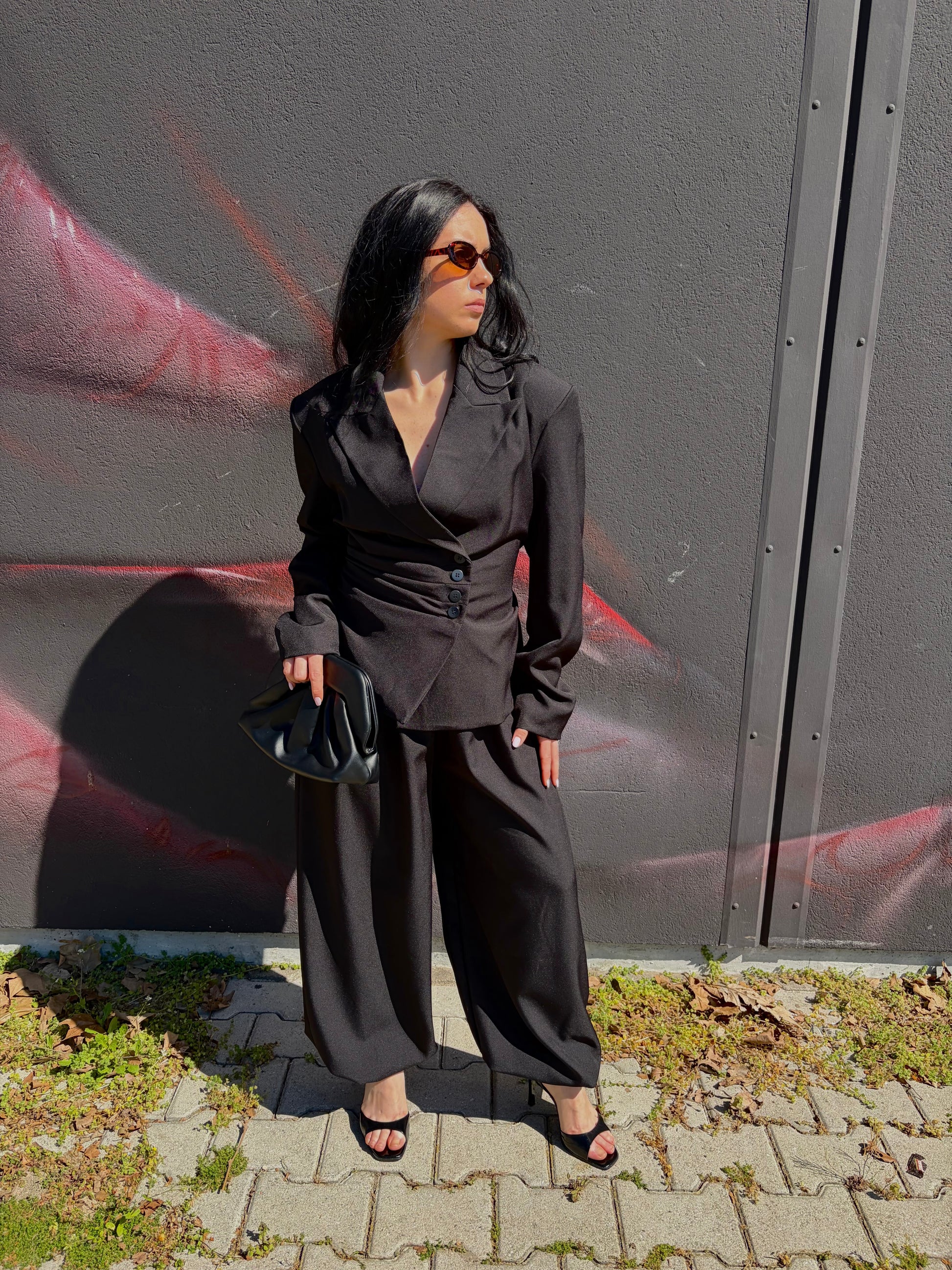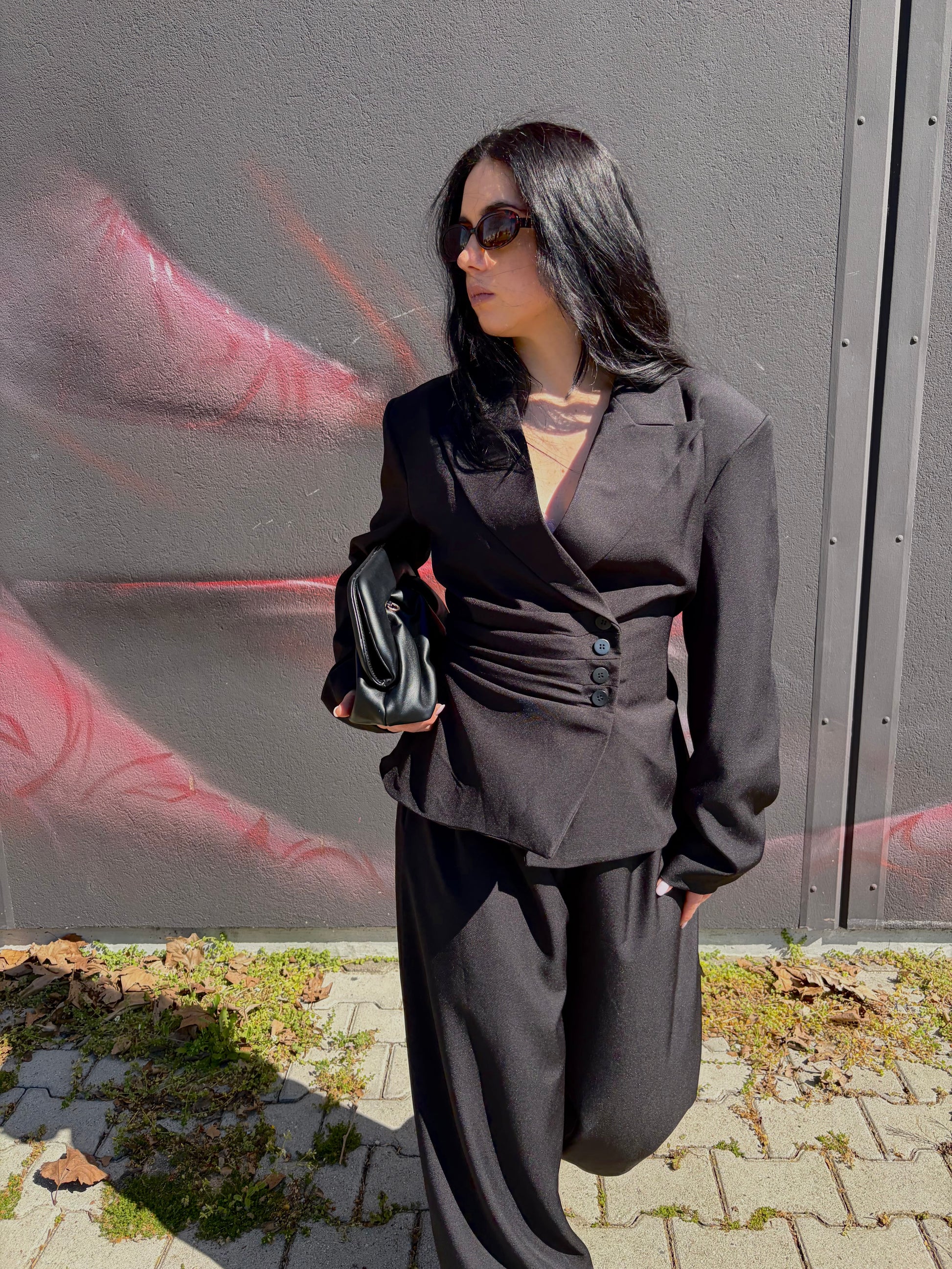 Il blazer presenta un laccio regolabile sul retro della schiena, chiusura frontale con bottoni e spalline strutturate che donano eleganza e definizione all’intero completo.