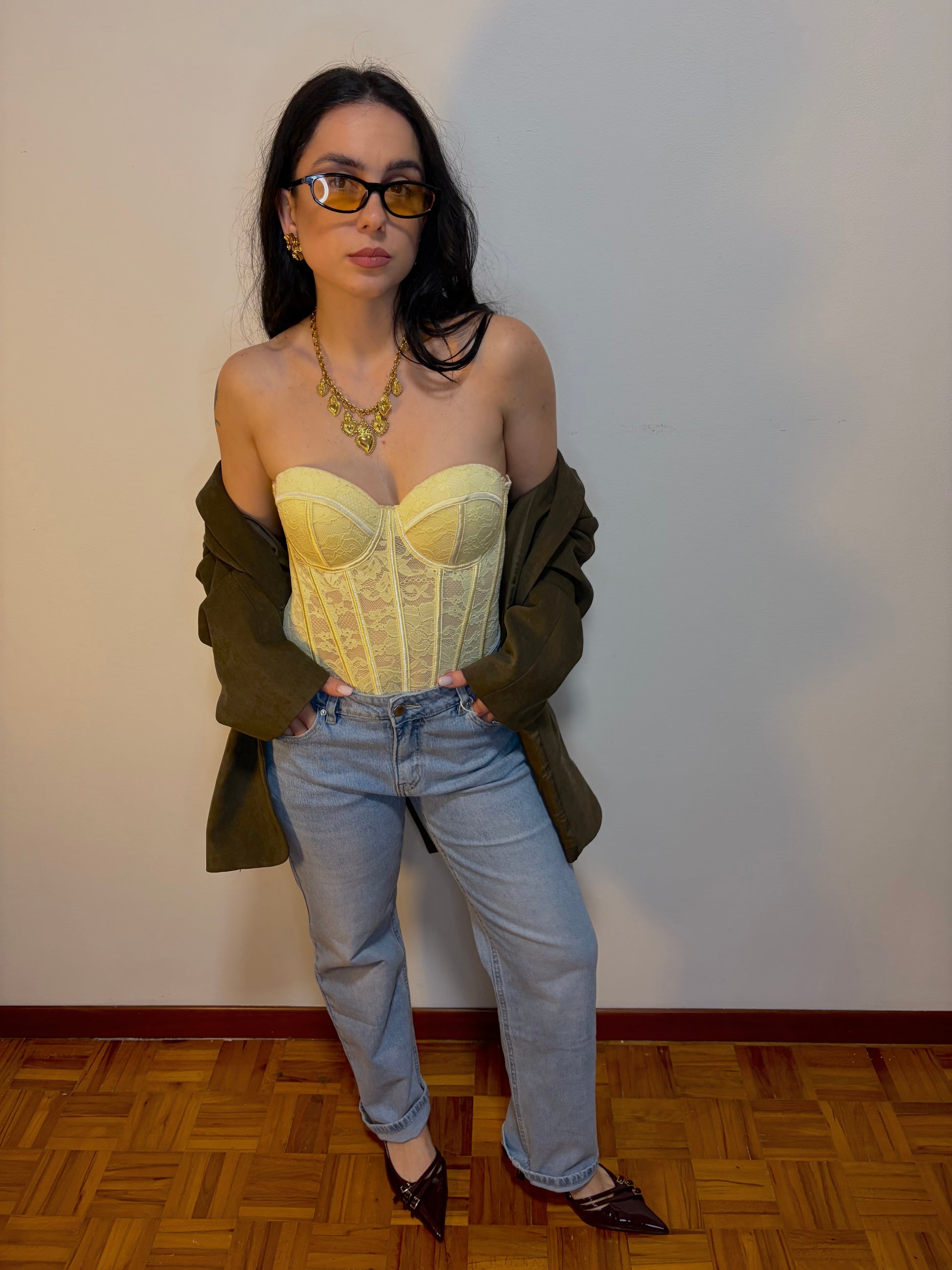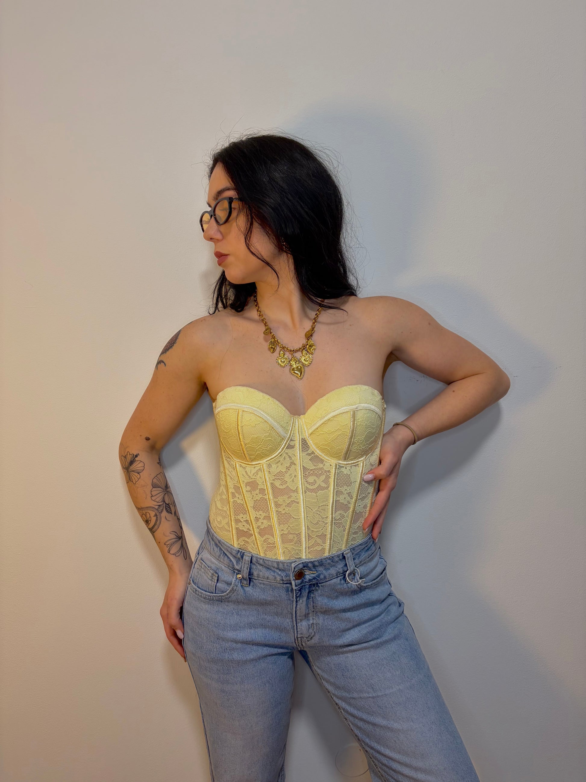 corpetto in pizzo giallo con coppe preformate, chiusura con ganci retro schiena.