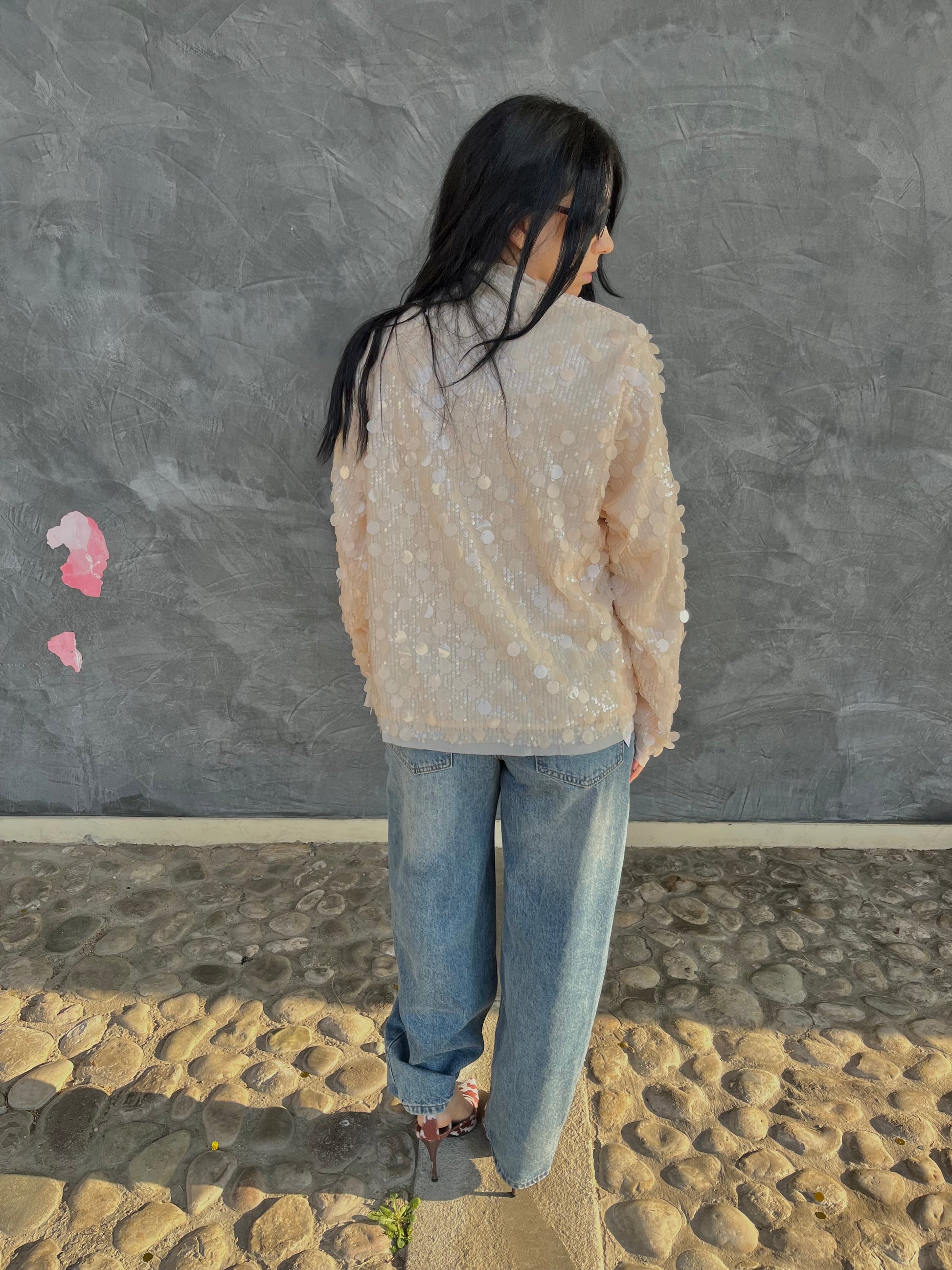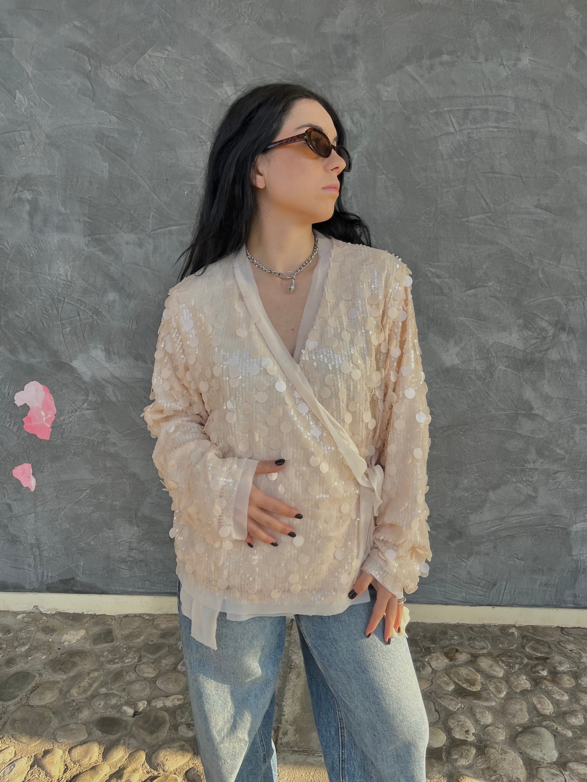 Chiusura incrociata sul davanti con lacci regolabili, scollo a V, maniche lunghe e fodera interna.